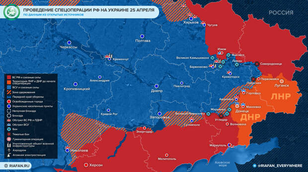 На своем брифинге Минобороны России сообщило, что ночью с 24 на 25 апреля высокоточным оружием большой дальности был нанесен удар по нефтеперерабатывающему предприятию в районе Кременчуга. В результате выведены из строя мощности для производства топлива и резервуары с горючим, предназначавшимся для снабжения ВСУ.